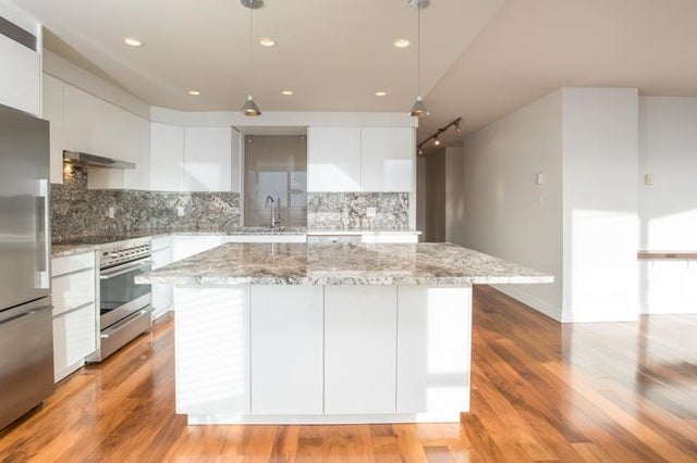 Located in the heart of New Westminster's Uptown area, in a Bosa built, well manage concrete building. Walking distance to shopping and sky train. This beautifully updated, open floor plan, 2 bedroom, 2 bath, plus den and separate laundry room home, features south west views of the Fraser River, engineered walnut floors, porcelain tile, wool carpets. The kitchen has granite counter tops, and large island with seating for four, Fisher & paykel, fridge, stove, hood fan and Miele dishwasher. Both stunning bathrooms have been beautifully renovated as well. There is one parking space and one large storage locker.